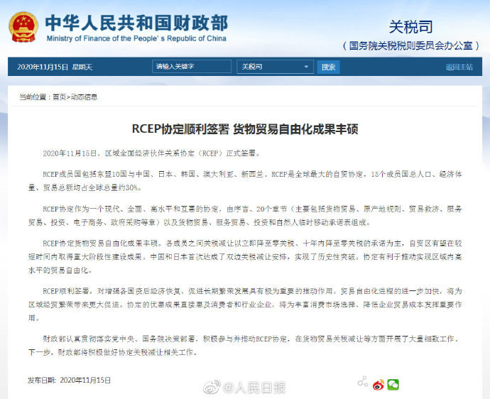【财政部:中日达成双边关税减让安排】据财政部官网,2020年11月15日,区域全面经济伙伴关系协定(RCEP)正式签署。RCEP15个成员国总人口、经济体量、贸易总额均占全球总量约30%。各成员之间关税减让以立即降至零关税、十年内降至零关税的承诺为主。中国和日本首次达成了双边关税减让安排,实现了历史性突破。协定有利于推动实现区域内高水平的贸易自由化。