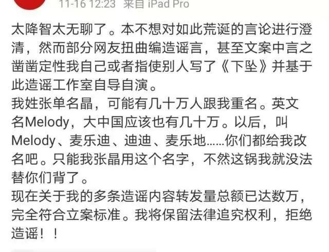 张晶发文辟谣,回应道:“你们都给我改名吧,只能我张晶用这个名字,不然这锅我就没法替你们背了。”还表示:“我将保留法律追究权利,拒绝造谣!”
