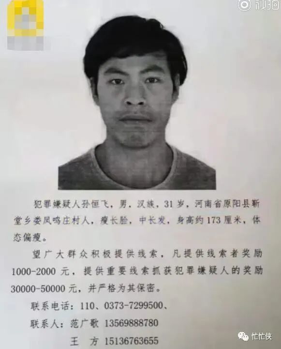 前述悬赏通告载明,犯罪嫌疑人孙某飞,男,汉族,31岁,河南省原阳县靳堂乡娄凤鸣庄村人,瘦长脸,中长发,身高约173厘米,体态偏瘦。望广大群众积极提供线索,凡提供线索者奖励1000-2000元,提供重要线索抓获犯罪嫌疑人的奖励30000-50000元,并严格为其保密。