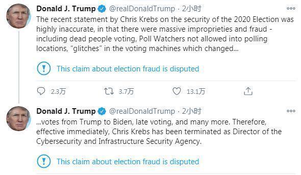 特朗普在社交媒体上称,克雷布斯最近关于2020大选安全性的声明“非常不准确”,因为“其中存在大量的不正当和欺诈行为等”。