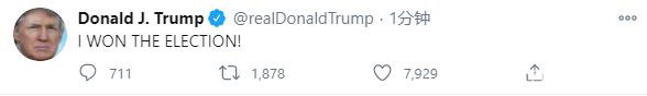 据媒体报道,接近美东时间16日凌晨0时,美国现任总统特朗普发推称“我赢了大选”