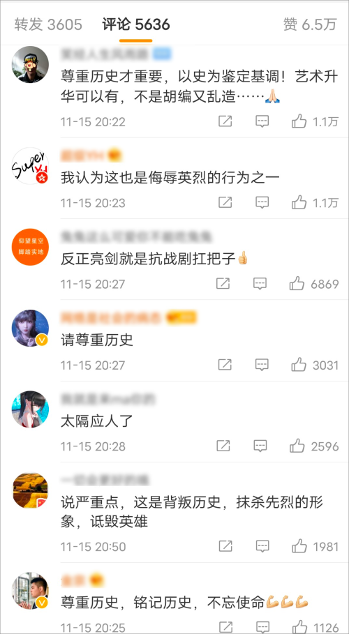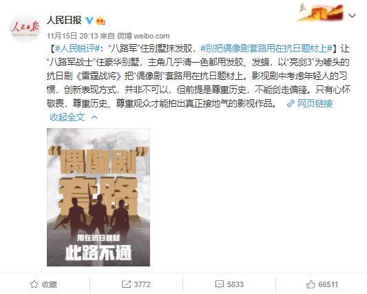 11月15日,《人民日报·人民锐评》发文点名批评该剧,认为该剧“把偶像剧套路用在抗战剧”上,“影视剧中考虑年轻人的习惯,创新表现方式,并非不可以,但前提是尊重历史,不能剑走偏锋。只有心怀敬畏,尊重历史、尊重观众才能拍出真正接地气的影视作品。”