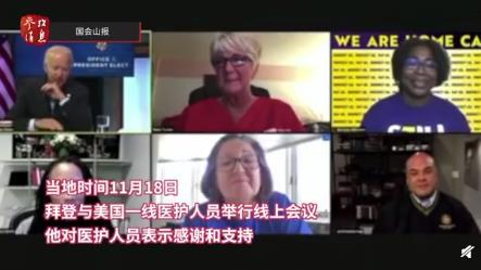 11月18日,拜登连线一线抗疫护士举行线上会议。表达对医护人员的慰问与感谢,期间拜登偷偷抹泪,并安抚医护人员的激动心情。