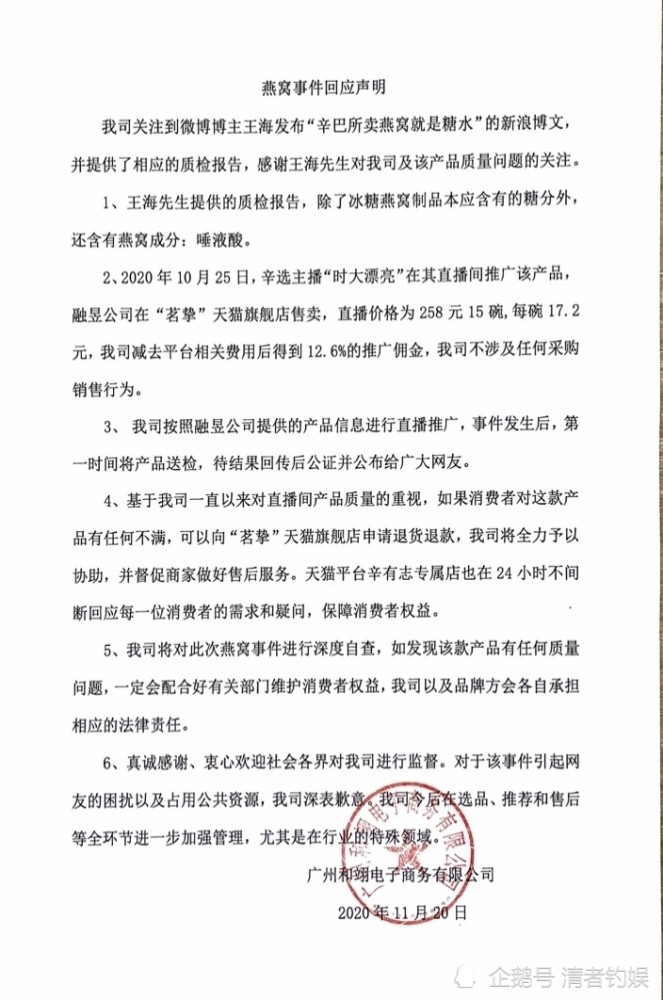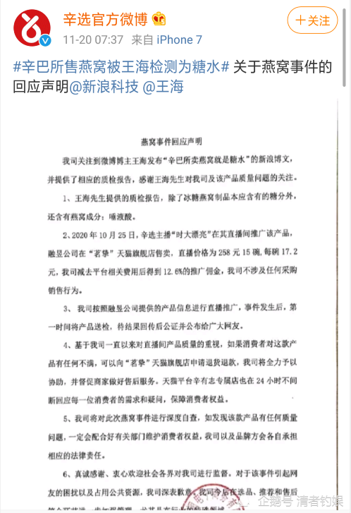虽说王海的做法是从利益那边去考虑的,但他之所以确定这个东西存在问题,一定是需要真实的材料的,不然再大的牛迟早也会被轻易戳破,什么也得不到,而辛巴方目前也拿出了自己的态度,值得肯定,但我们还是需要等待燕窝的检测结果,我感觉直播卖货就跟代言差不多,所谓的“代言人”究竟需不需要为产品的质量负责呢?这个问题很久之前网友们就争论过了,如果不负责的话,那么岂不是代言人无所顾忌了,为此我还是支持“代言人”是需要为正在“代言”的产品负责任的,这个责任如何承担,则需要具体去判断了,因为这样设置的话,才会让选品环节更为严谨。