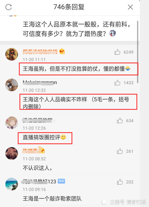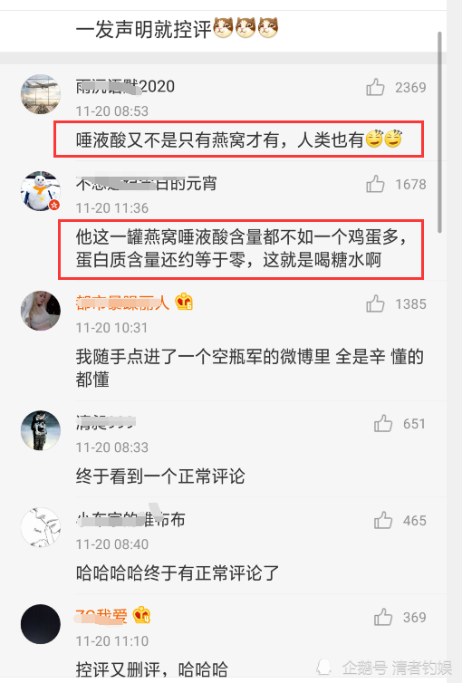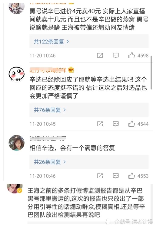 第一条评论是指责王海这个人人品一般,可信度不高,而在这一层,下面的留言分外精彩,一位网友称:“王海虽狗,但是不打没胜算的仗,懂的都懂!”“唾液酸又不只是燕窝才有,人也有。”还有人模仿控评的模样,更有人直接指控饭圈控评,当然,在一些反对的声音下,也有提出其他质疑的声音。