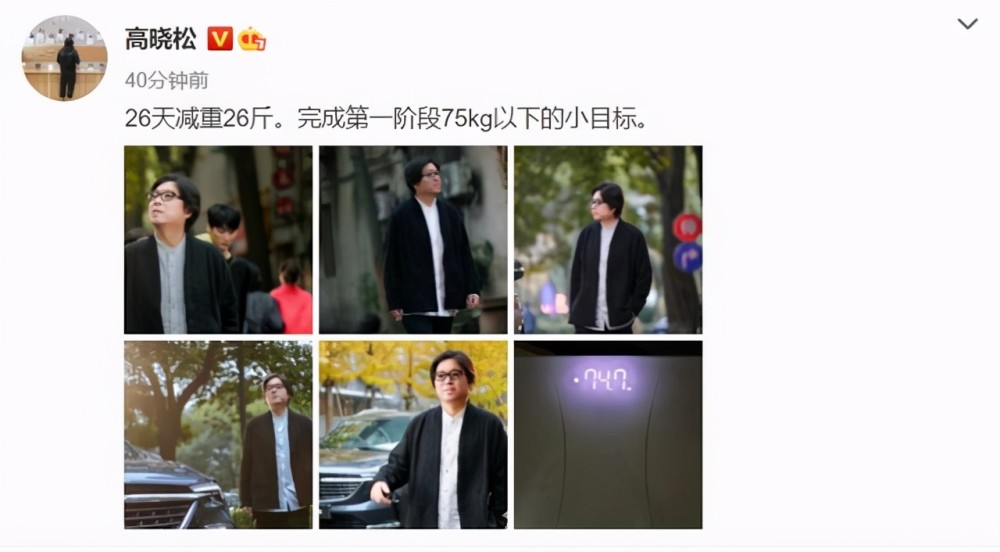 11月24日的高晓松放出自己减肥计划之后的新成果,高晓松发文:26天减重26斤,完成第一阶段75kg以下的小目标。