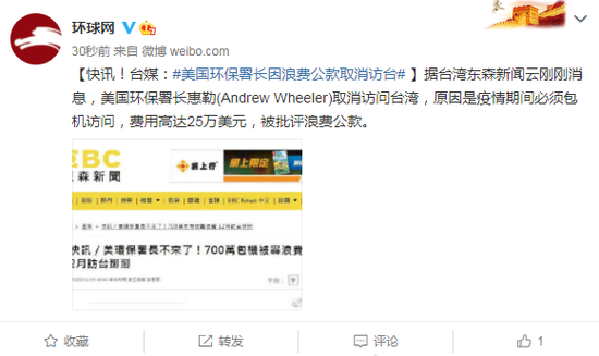 据台湾东森新闻云刚刚消息,美国环保署长惠勒(Andrew Wheeler)取消访问台湾,原因是疫情期间必须包机访问,费用高达25万美元,被批评浪费公款。
