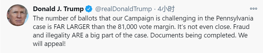 紧接着,他继续发推指责道:“我们竞选团队在宾夕法尼亚州挑战的选票数量远远超过了81000张选票的差额。而且还差得远呢。欺诈和违法行为是本案的主要问题。文件还在完成之中。我们将上诉!”。