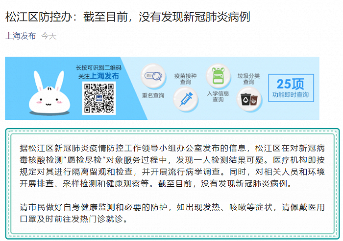 原标题:上海松江:一人检测结果可疑,目前未发现新冠确诊病例