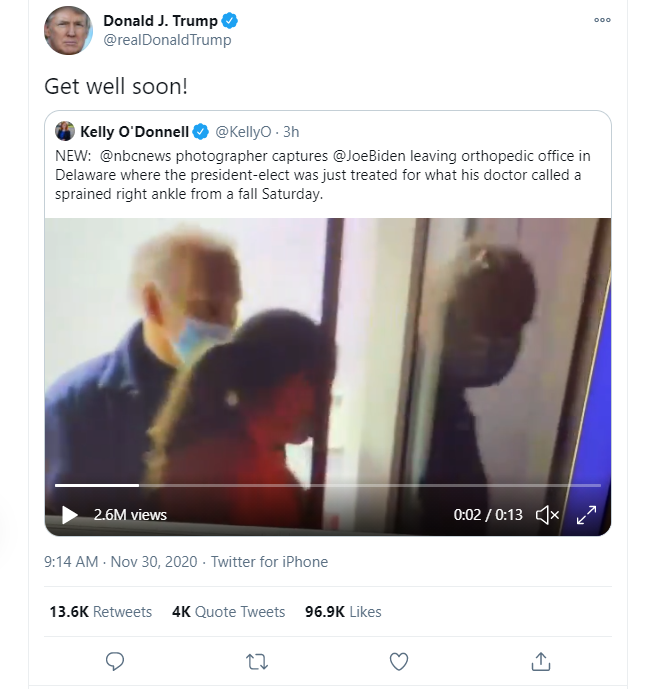 就在拜登扭脚事件曝出后不久,特朗普在推特上对拜登表达了问候,他在推特上写道:“赶紧好起来(Get well soon!)”