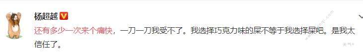 天气网:杨超越还有多少一次来个痛快是怎么回事?杨超越为什么说还有多少一次来个痛快?晚间杨超越突然发文称:“还有多少一次来个痛快,一刀一刀我受不了。我选择巧克力味的屎不等于我选择屎吧。是我太信任了。”