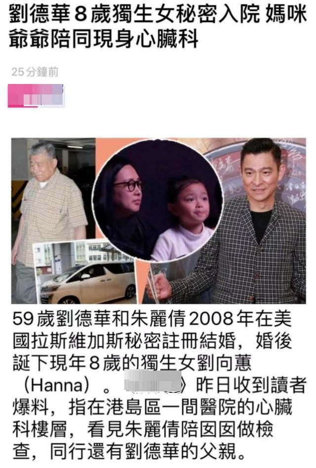 12月3日晚,港媒报道,刘德华8岁女儿刘向蕙秘密入院,在妈妈跟爷爷的陪伴下,现身医院心脏科。刘德华本人则在内地工作,前几天曾到厦门出席电影活动,现于深圳拍摄新电影。