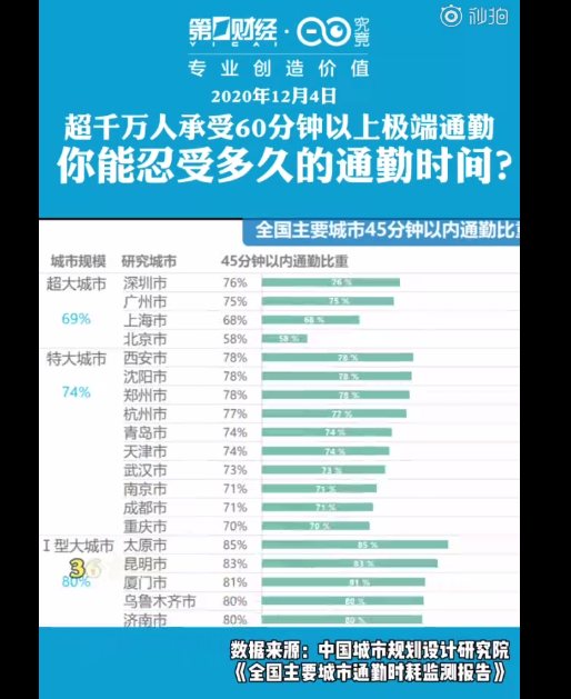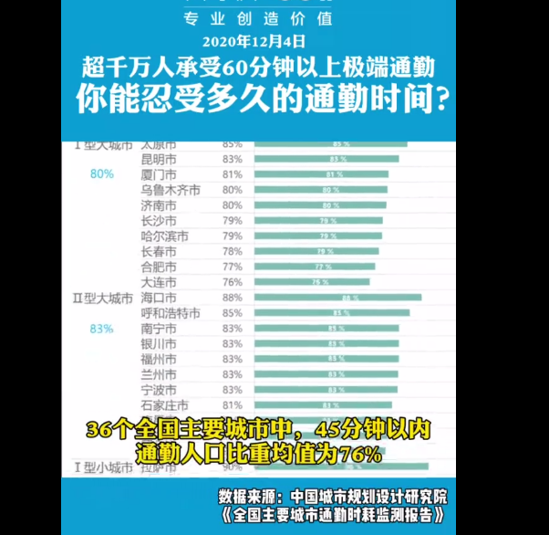 话说,中国城市规划设计研究院4日发布《全国主要城市通勤时耗监测报告》,计算了36个城市的单程平均通勤时耗、城市45分钟通勤可达人口比重、单程超过60分钟通勤人口比重。