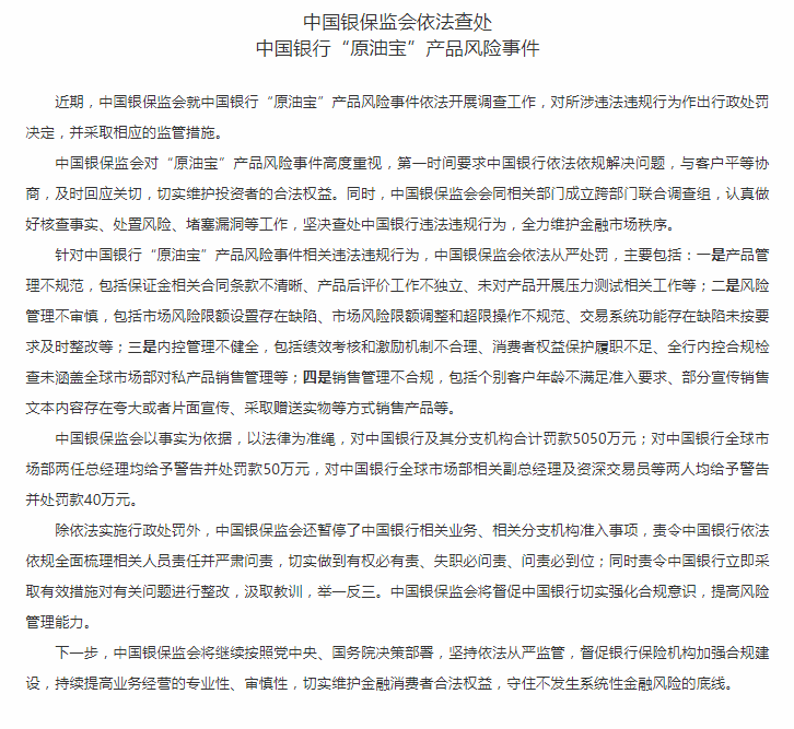中国银保监会对“原油宝”产品风险事件高度重视,第一时间要求中国银行依法依规解决问题,与客户平等协商,及时回应关切,切实维护投资者的合法权益。同时,中国银保监会会同相关部门成立跨部门联合调查组,认真做好核查事实、处置风险、堵塞漏洞等工作,坚决查处中国银行违法违规行为,全力维护金融市场秩序。