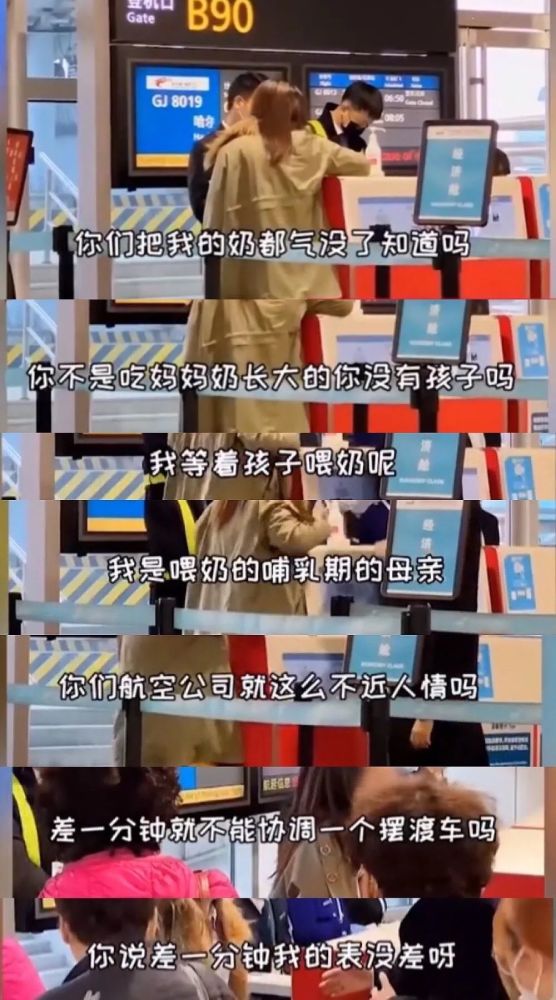 当时,检票员告知该女子已经迟到一分钟,该女子拍着服务台,大声回答道:“我没晚!我是一个哺乳期的母亲,等着给孩子喂奶呢!”