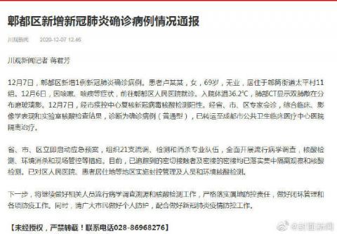 成都新增1例本土确诊12月7日,四川成都郫都区新增1例新冠肺炎确诊病例。患者卢某某,女,69岁,无业,居住于郫筒街道太平村11组。12月6日,因咳嗽、咳痰等症状,前往郫都区人民医院就诊。入院体温36.2℃,肺部CT显示双肺散在分布磨玻璃影。12月7日,经市疾控中心复核新冠病毒核酸检测阳性。经省、市、区专家会诊,综合临床、影像学表现和实验室核酸检查结果,诊断为确诊病例(普通型),已转运至成都市公共卫生临床医疗中心医院隔离治疗。省、市、区立即启动应急预案,组织21支流调、检测和消杀专业队伍,全面开展流行病学调查,核酸检测、环境消杀和现场管控等措施。目前,已追踪到的密切接触者及密接的密接均已落实集中隔离观察和核酸检测。已对区人民医院、患者居住地等地区实施封控管理及人员和环境核酸检测。(川观新闻)