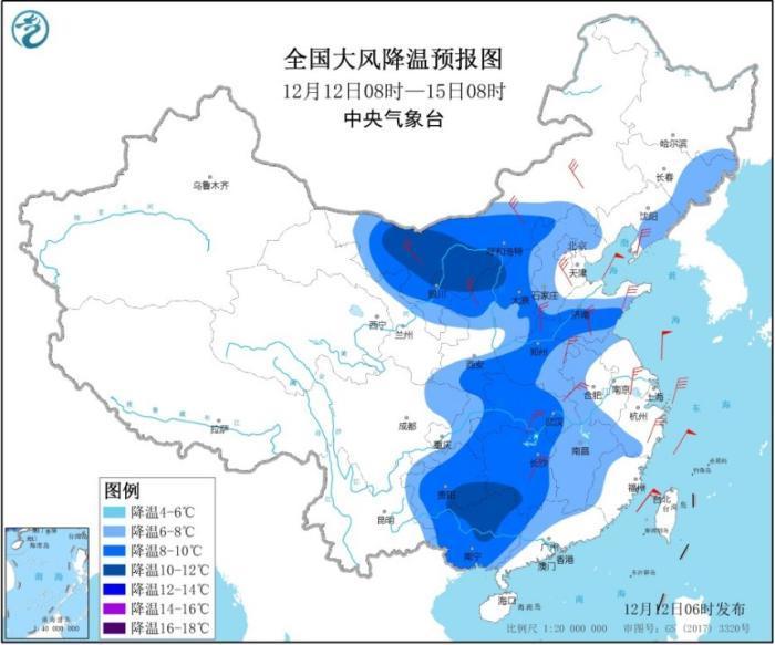 受强冷空气影响,预计,12月12日08时至12月15日08时,西北地区东部、内蒙古中西部、华北中西部、东北地区东部、黄淮大部、江汉、江淮西部、江南中西部、西南地区东部、华南中西部等地将先后降温6~8℃,其中,陕西北部、内蒙古西部、湖南西南部、贵州东南部、广西北部等地的部分地区降温可达10℃;降温过后最低气温0℃线将南压至贵州南部至浙江西北部一线。北方地区有4~6级、阵风7~8级的偏北风,南方地区有4~5级偏北风,江河湖面阵风可达6~7级,近海海区有6~8级、阵风9级的偏北风。