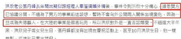 在小编看来,明星们的婚姻一旦被传出有破裂的迹象,很多的媒体就会肆无忌惮的报道,并且很多时候都是没有真凭实据的,不过有时候也确实是真的。这样的情况在娱乐圈屡见不鲜了。不过还是希望洪欣和张丹峰能够和好如初,毕竟两个人都是有两个孩子的人了,又到了不年轻的年纪,过一辈子才算一段美好的婚姻呐!