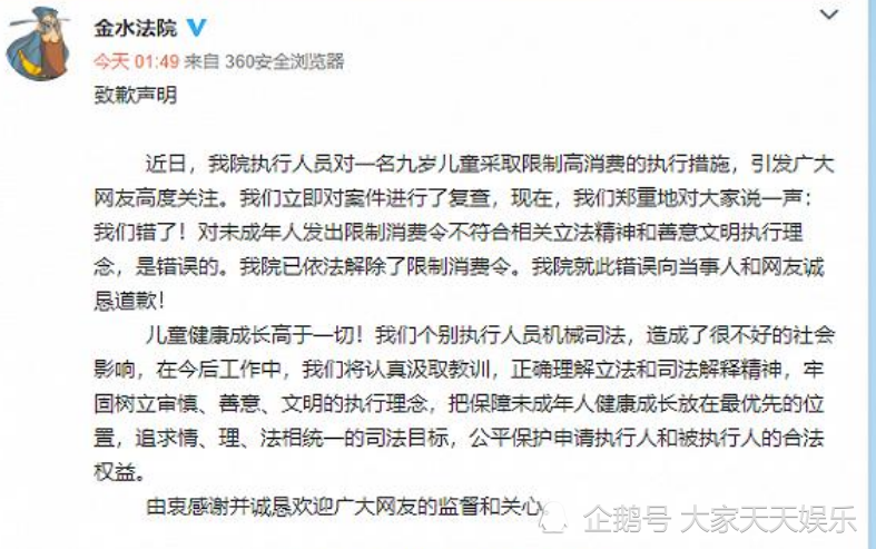 法院执行人员对一名九岁儿童采取限制高消费的执行措施,引发广大网友高度关注。法院声明:我们立即对案件进行了复查,我们郑重地对大家说一声:我们错了!对未成年人发出限制消费令不符合相关立法精神和善意文明执行理念,是错误的。我院已依法解除了限制消费令。我院就此错误向当事人和网友诚恳道歉!