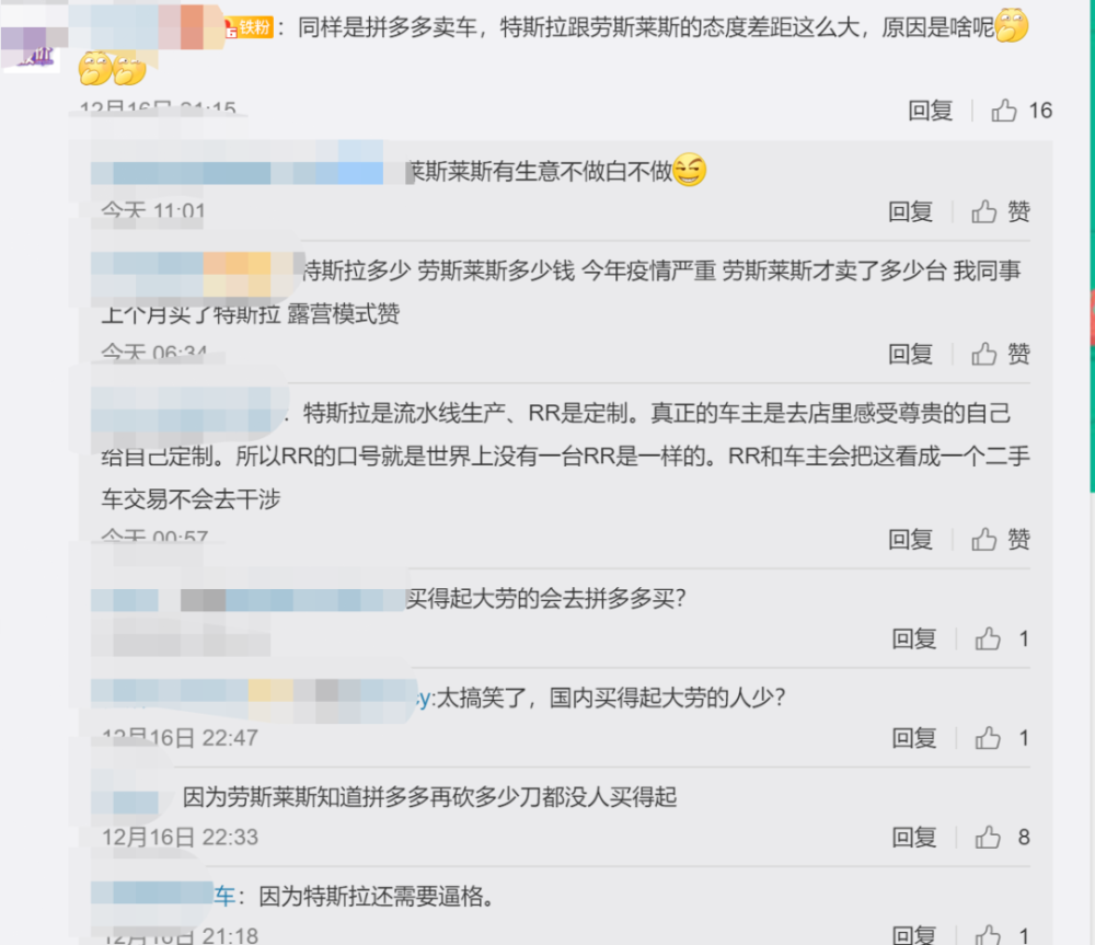 此外,还有人将劳斯莱斯和此前特斯拉的回应放在一起对比。众所周知,8月,拼多多推出特斯拉团购活动,结果特斯拉不认,说两家公司并无任何合作,认为拼多多扰乱特斯拉价格体系,坚持直营模式。