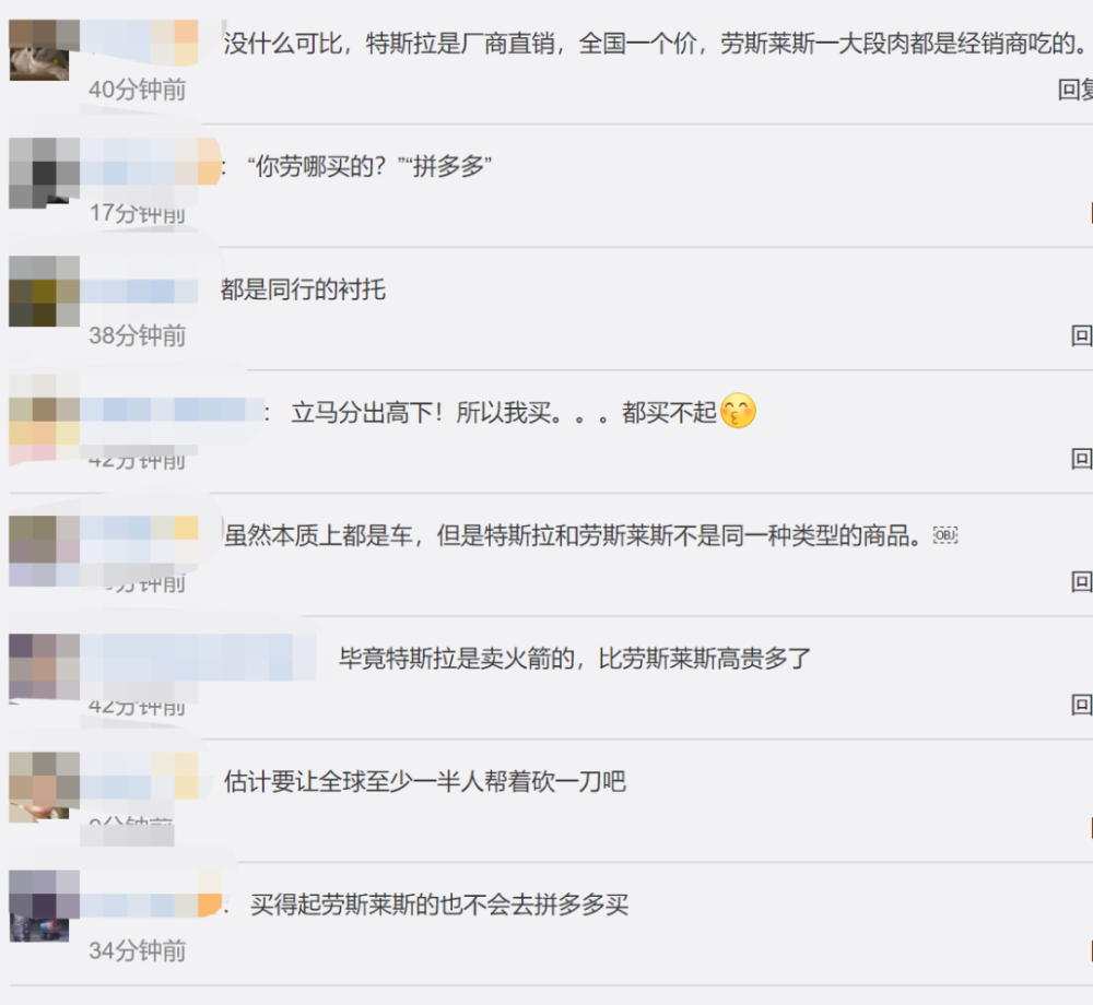 但也有网友指出,没什么可比,特斯拉是厂商直销,全国一个价,劳斯莱斯一大段肉都是经销商吃的。