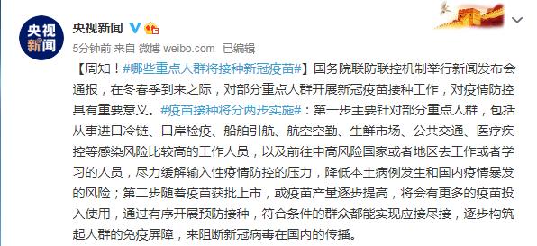 国务院联防联控机制举行新闻发布会通报,在冬春季到来之际,对部分重点人群开展新冠疫苗接种工作,对疫情防控具有重要意义。#疫苗接种将分两步实施#:第一步主要针对部分重点人群,包括从事进口冷链、口岸检疫、船舶引航、航空空勤、生鲜市场、公共交通、医疗疾控等感染风险比较高的工作人员,以及前往中高风险国家或者地区去工作或者学习的人员,尽力缓解输入性疫情防控的压力,降低本土病例发生和国内疫情暴发的风险;第二步随着疫苗获批上市,或疫苗产量逐步提高,将会有更多的疫苗投入使用,通过有序开展预防接种,符合条件的群众都能实现应接尽接,逐步构筑起人群的免疫屏障,来阻断新冠病毒在国内的传播。