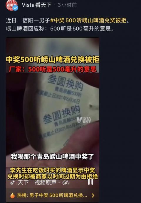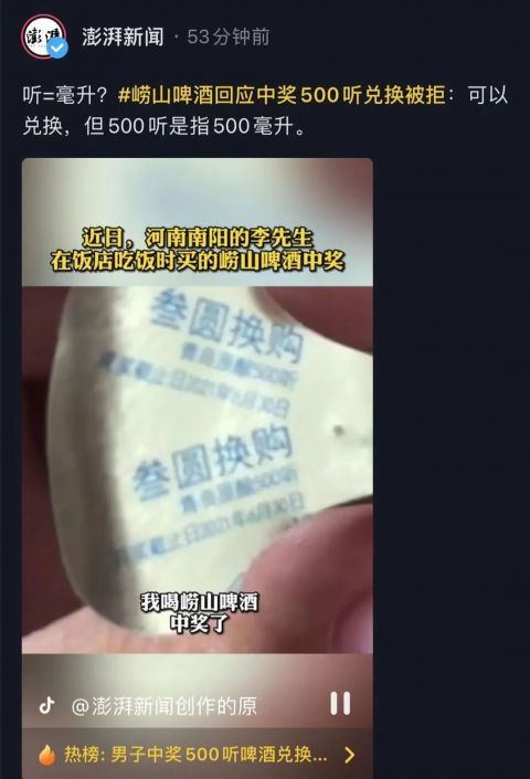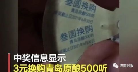 而崂山啤酒客服人员回应称换购青岛原酿500听是指500毫升不是指500罐据@沸点视频,12月20日,南阳的李先生在饭店吃饭时,无意中发现买的崂山啤酒中奖,显示 3元换购青岛原酿500听 。心情激动的李先生表示, 我可能要发达了!我喝了个青岛崂山啤酒,中奖了!500听,看到没有,截止到明年6月31日。