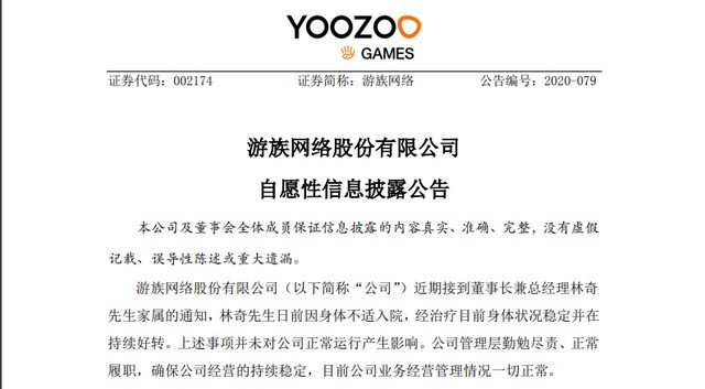 不过就在警方通报游族CEO疑似中毒之后,深交所上市公司游族网络披露公告予以回应。公告称,近期接到董事长兼总经理林奇家属的通知,林奇日前因身体不适入院,经治疗目前身体状况稳定并在持续好转。