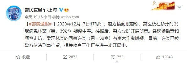 目前,警方通报游族CEO疑似中毒的消息来自微博@警民直通车-上海,12月23日消息,2020年12月17日17时许,警方接到报警称,某医院在诊疗时发现病患林某(男,39岁)疑似中毒。接报后,警方立即开展侦查。经现场勘查和调查走访,发现林某的同事许某(男,39岁)有重大作案嫌疑。目前,许某已被警方依法刑事拘留,相关侦查工作正在进一步开展中。