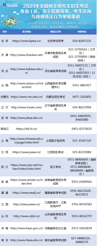 为方便考生及时了解招生政策、考试安排、疫情防控要求等信息,顺利参加考试,同时严厉打击涉考违法活动,严肃考试纪律,维护考生合法权益,现公布2021年全国硕士研究生招生考试各省(区、市)信息发布、考生咨询与违规违法行为举报等渠道。
