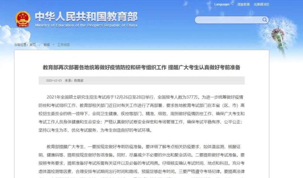 2021年全国硕士研究生招生考试将于12月26日至28日举行,全国报考人数为377万。为进一步统筹做好疫情防控和考试组织工作,教育部再次部署各地统筹做好疫情防控和研考组织工作 ,提醒广大考生认真做好考前准备。