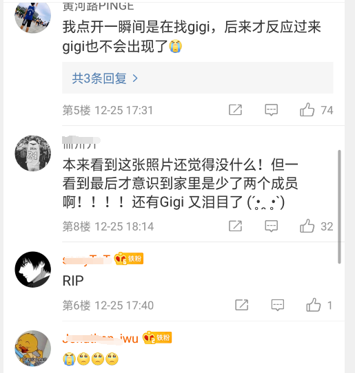 曾经的圣诞节,这一大家子穿的都是最鲜艳的衣服,是明亮的大红色,大家的照片的底色也很亮,是很美丽的外景,而今虽然大家很坚强,但还是有一些东西在悄然改变着,难免会令人心酸,尤其是看了网友的发言后,更觉得有一些难过,一位网友说:“我点开一瞬间是在找gigi,后来才反应过来gigi也不会出现了。”