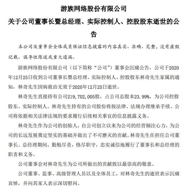 12月25日晚间,游族网络发布公告称,公司董事长暨总经理、实际控制人、控股股东林奇病救治无效,于2020年12月25日逝世。游族董事长去世,此前遭同事投毒,游族CEO林奇确认投毒身亡,董事长去世 游族公司门前摆满花束,令人唏嘘感慨!