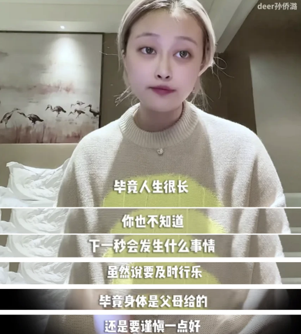 在视频里,孙侨潞看上去显得特别开心,她像一位知心大姐姐在劝导粉丝们要爱惜自己的身体。她说:我们每个人都有选择和支持自己身体的权利,但是也要小心,三思而后行,不要为自己的盲目冲动买单,毕竟人生很长,你也不知道下一秒会发生什么事情,虽然说要及时行乐,但是身体毕竟是父母给的,还是要谨慎一点好。