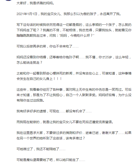 孙侨潞的妈妈在文案中证实女儿去世的消息,原来孙侨潞去世时间是元月一日。这本是一个万家团聚共享天伦之乐的日子,但是孙侨潞的家人却面临人生中最黑暗的一天。正如孙妈妈所说,女儿还那么年轻,还没有结婚,还没有生子,人生一切美好的事她都还未来得及享受,就那么突然的离开了,这真是太令人遗憾了。对于孙侨潞的死因孙妈妈也做出了解释,原来女儿是因为心梗才导致猝死的。
