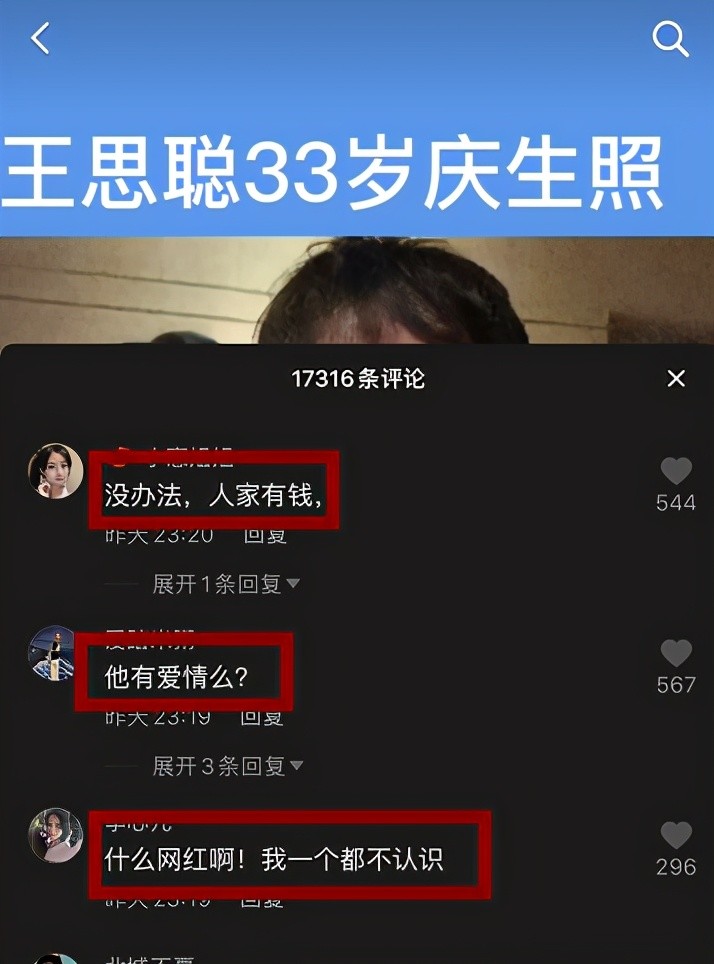 不过也有网友对王思聪此举不看好。虽然王思聪有钱,但是在大家看来王思聪没有爱情。或许,爱情对于富人来说就是奢侈品吧。除了爱情以外,也有人吐槽王思聪合影的网红美女。有网友表示:“什么网红啊,我一个都不认识”。事实上,合影的网红美女的确有点面生。公开参加王思聪生日宴合影,估计也是想要借助王思聪的热度。站在爱情的角度,无疑是王思聪的悲哀。