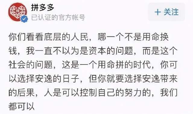 然而,拼多多的知乎账号发布了一个评论,再一次将拼多多推向风口浪尖。4日8时19分49秒,拼多多创建回答「你们看看底层的人民,哪一个不是用命换钱,我一直不以为是资本的问题,而是这个社会的问题,这是一个用命拼的时代,你可以选择安逸的日子,但你就要选择安逸带来的后果,人是可以控制自己的努力的,我们都可以」。