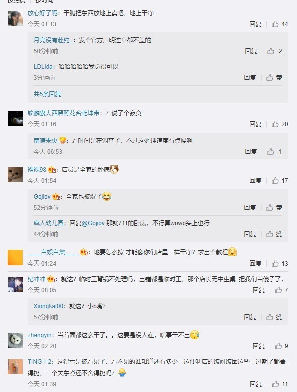 随后网络上再度爆出店长回应关东煮掉地上接着卖事件,称是掉桌上,已整锅扔掉。顾客对店员的行为提出质疑,店员回应称地每天都擦,香肠都已经冲干净了。对于掉出来的食物按流程都应直接扔掉,该店员刚来不太了解,目前已经将整锅关东煮扔掉。