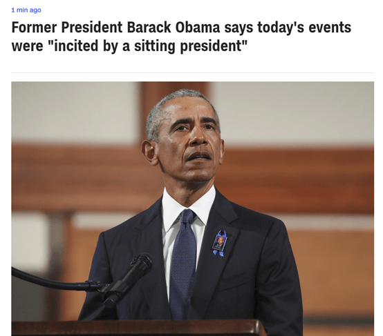 美国前总统奥巴马发表声明谴责,“历史将正确地记住,今天发生在国会大厦的暴力事件,是由一位现任总统煽动的,他继续在合法选举结果上毫无根据地撒谎,这是我们国家巨大的耻辱和蒙羞的时刻。但如果我们把它完全当作一个惊喜,那就是自欺欺人了。”