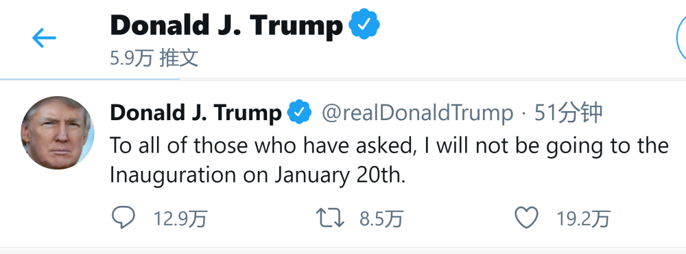 8日当天,特朗普在其推特账号上发文称:“给所有向我提问的人,我不会去参加1月20日的就职仪式。”