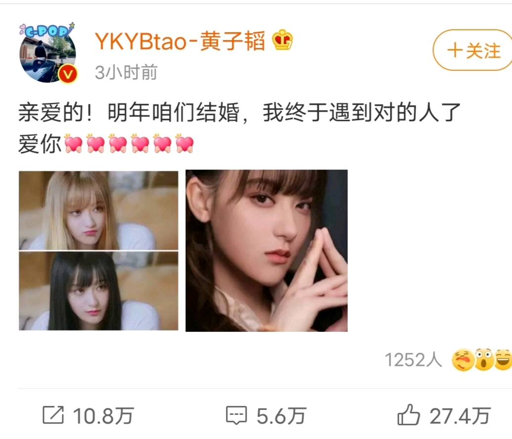 7日,YKYBtao-黄子韬晒出性转后的自己的照片表白道,“亲爱的!明年咱们结婚,我终于遇到对的人了,爱你”。