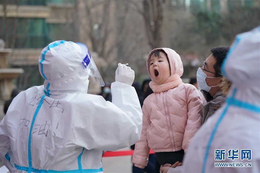 1月6日,一名小朋友在石家庄市桥西区恒大城内接受核酸采样。图丨新华社