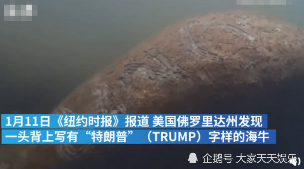 美国一只海牛背上被刻特朗普名字。当地时间1月10日,美国佛罗里达州的一条河中,一只海牛背部被刻上特朗普的名字“TRUMP”。因为海牛背上长了许多海藻,目前尚不清楚海牛是否受到严重伤害。目前,当地有相关部门已经悬赏5000美元征集相关信息。