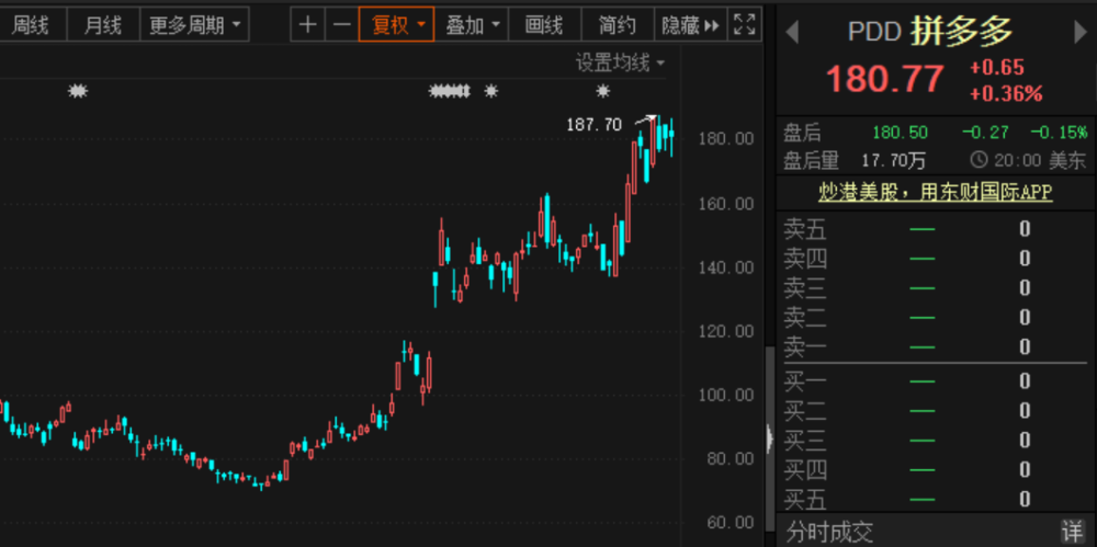 值得一提的是,尽管关于“员工”事件的负面新闻频发,拼多多股价却屡创新高。1月4日,拼多多股价跌至166.78美元,下跌6.13%。1月5日拼多多股价再次暴涨,截至当日收盘股价大涨12.24%,总市值超2250亿美元,再创历史新高。截至1月8日,拼多多收报180.77美元,最新市值2217亿美元。