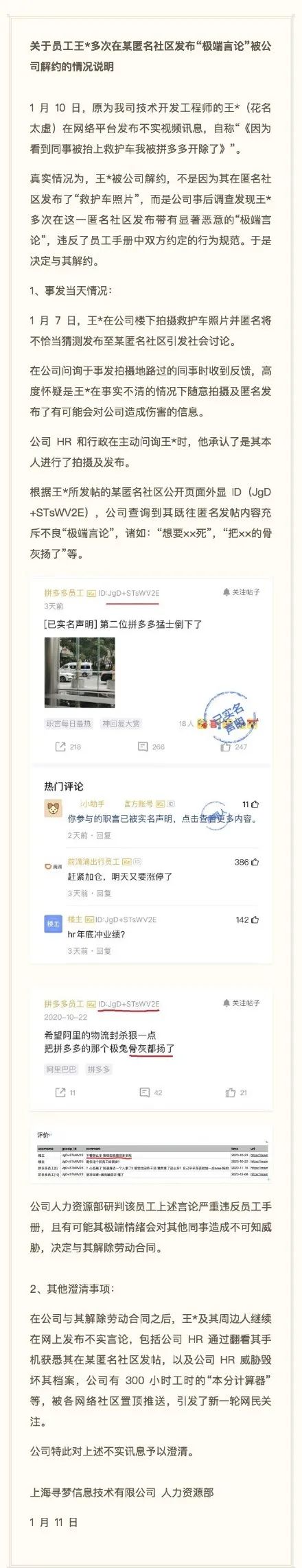 1月11日,针对员工王某(花名太虚)在网络平台发布相关视频讯息,自称“《因为看到同事被抬上救护车我被拼多多开除了》”一事,拼多多人力资源部发布情况说明表示,王某被公司解约,并非因为其在匿名社区发布了“救护车照片”,而是公司事后调查发现王某多次在这一匿名社区发布带有显著恶意的“极端言论”,违反了员工手册中双方约定的行为规范。于是决定与其解约。