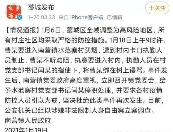 近日,一段老人外出被身穿红马甲的人绑在树上的视频引发网民广泛关注。1 月 20 日 3 时许,藁城区通过"藁城发布"微博发布《情况通报》称, 1 月 18 日,曹某不听执勤人员劝阻要进入南营镇水范寨村买烟,该村党支部书记闫某指使执勤人员将曹某绑在树上并谩骂。