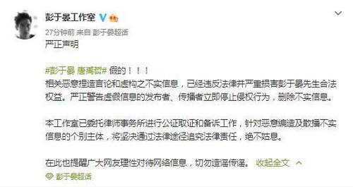 1月26日凌晨,彭于晏工作室发出严正声明回击网络上的谣言,工作室表示对于恶意捏造和虚构的不实言论已经损害了彭于晏的合法权益,并且违反了法律,在声明中工作室要求虚假信息发布者和传播者立即停止侵权,工作室也已经进行取证,将会诉诸法律。