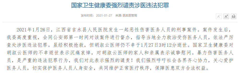 国家卫健委1月27日发文称,2021年1月26日,江西省吉水县人民医院发生一起恶性伤害医务人员的刑事案件。案件发生后,我委高度重视,会同公安部第一时间对该案件进行督办,指导当地全力救治受伤医务人员,依法严厉查处涉医违法犯罪。虽经积极抢救,但胡淑云医师仍不幸于1月27日3时12分逝世。