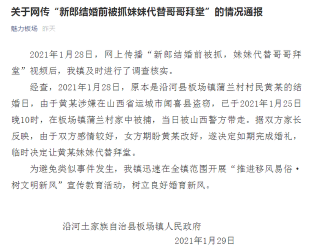 据“魅力板场”微信公众号消息,贵州省铜仁市沿河土家族自治县板场镇人民政府通报,2021年1月28日,网上传播“新郎结婚前被抓,妹妹代替哥哥拜堂”视频后,板场镇及时进行了调查核实。