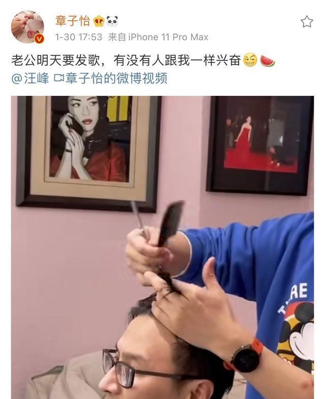 章子怡在社交账号上发布一段汪峰剃寸头视频,预告老公明天新歌。
